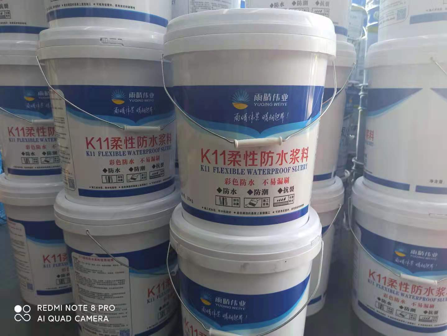 聚合物水泥防水浆料又称作"k11防水涂料”是由优质聚合物乳液和多种添加剂组成的有机液料,并以优质水泥、助剂等组成的粉料,经一定比例配制而成的双组份防水材料,分为通用型和柔韧型两种。通用型涂料成膜后形成具有一定柔韧性的防水涂层,同时又有极好的抗裂性和耐冲击性,能抵御基层的物理震动以及一定程度的位移。柔韧型涂料成膜后形成一层坚韧的弹性防水膜,该膜对混凝土和灰浆有良好的粘附性,能与之形成紧密牢固的永久性结合,阻止了水的渗透。